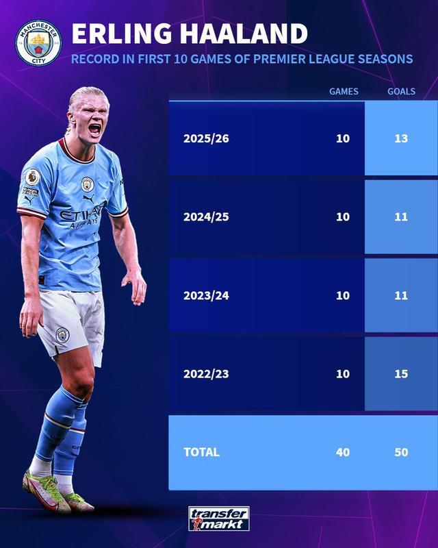 哈蘭德曼城生涯英超賽季前10輪進(jìn)球統(tǒng)計(jì)